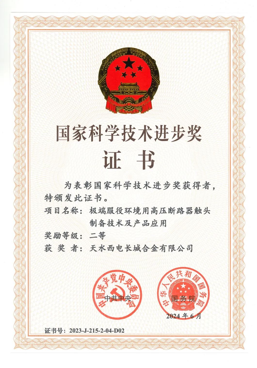 天水合金1項成果榮獲國家科學技術進步獎二等獎